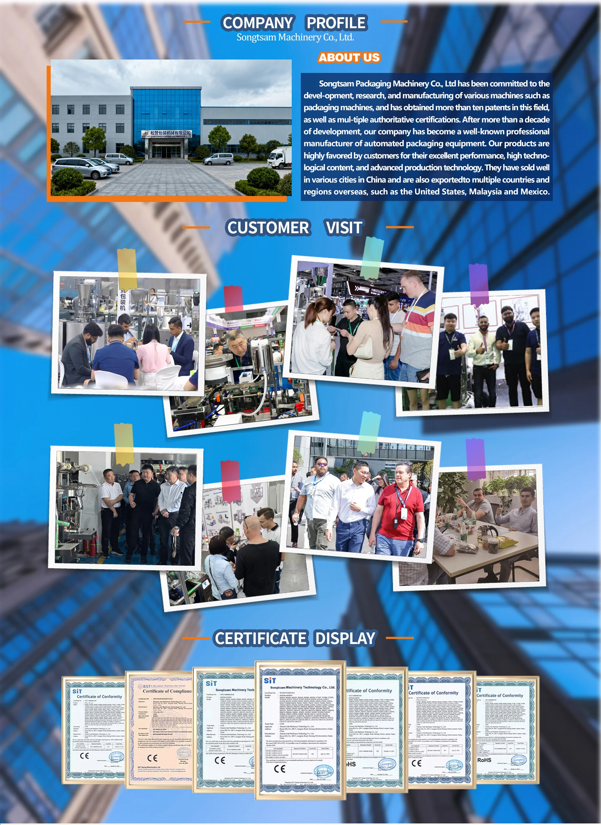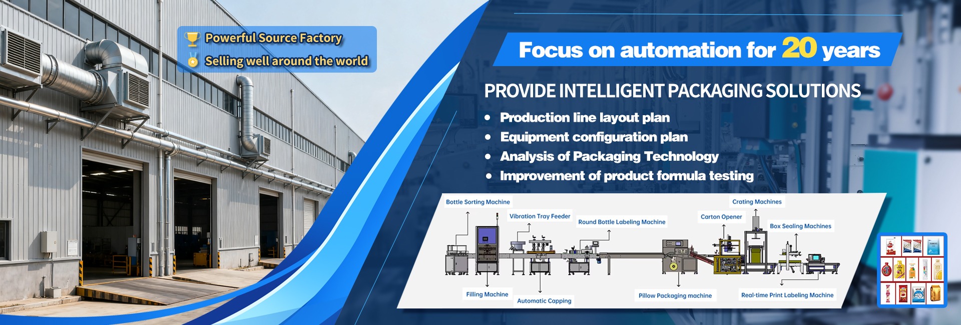 Productos principales:Máquina de llenado, máquina de embalaje multifuncional, línea de producción de embalaje, paletizador, otros equipos de embalaje